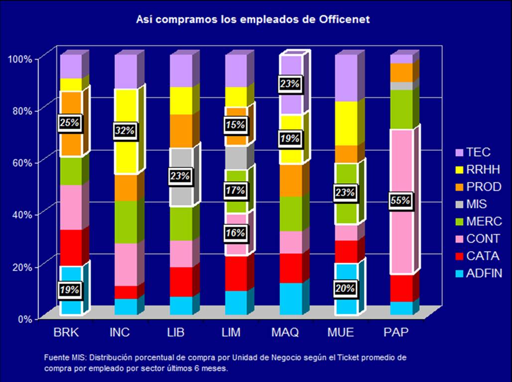 Los asociados (como les decimos en Staples a los empleados) de Officenet también son clientes de Officenet, con un perfil claramente diferente a las empresas, y dejando vislumbrar cómo se comportan los individuos con respecto a la compra de PRODUCTOS DE OFICINA, tienen un nivel de Integralidad mayor a lo que vemos habitualmente en los clientes B2B, vean su comportamiento promedio en el siguiente cuadro: