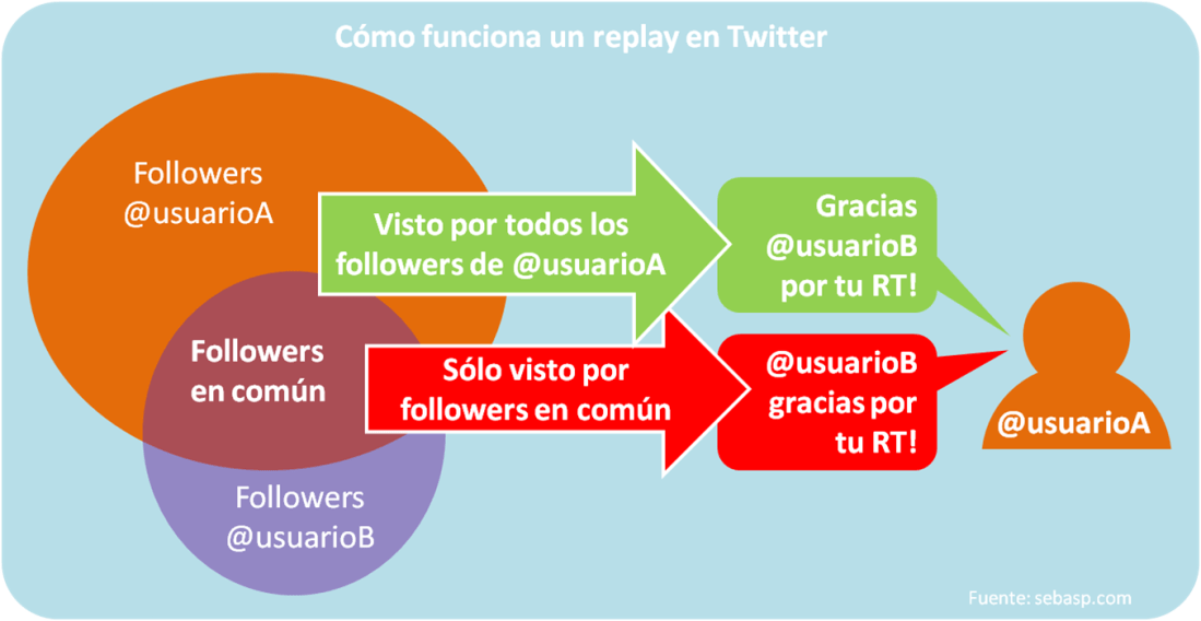 «Cuando se le responde a un usuario iniciando el twit con un @usuario ese twit sólo será visto por los followers compartidos entre el usuario emisor del twit y el @usuario al que se le está respondiendo, mientras que si el twit comienza con un caracter o una palabra cualquiera (inclusive si comienza con un #hashtag) ese twit será visible para todos los followers del usuario emisor del twit»