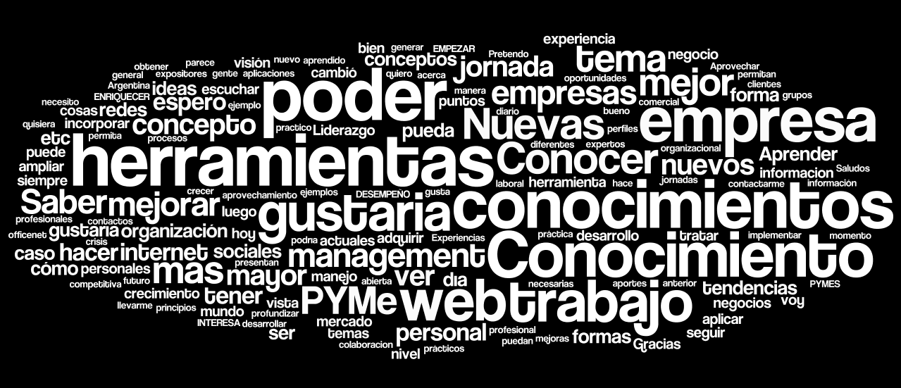 86 de las 109 personas que contestaron la encuesta respondieron la pregunta abierta de qué expectativas tenían o qué les gustaría llevarse del encuentro, en la siguiente imagen se traducen en formato de tagcloud: